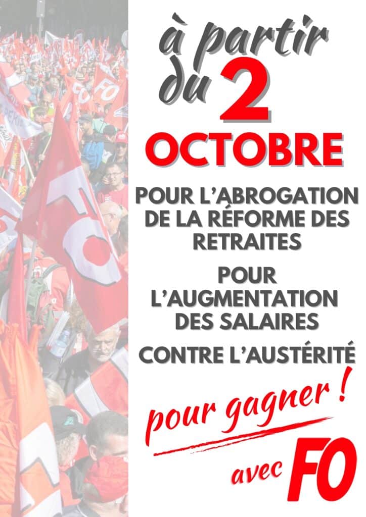 C’est pourquoi, la FNEC FP-FO fait sienne la résolution du comité confédéral national FO, réuni le 25 septembre : « Pour gagner sur les revendications, à commencer par l’abrogation de la réforme des retraites et l’abandon de tout budget d’austérité, le CCN appelle toutes les structures à réunir les salariés pour discuter et décider la grève et sa reconduction, à partir du 2 octobre, dans l’action commune partout où c’est possible. »