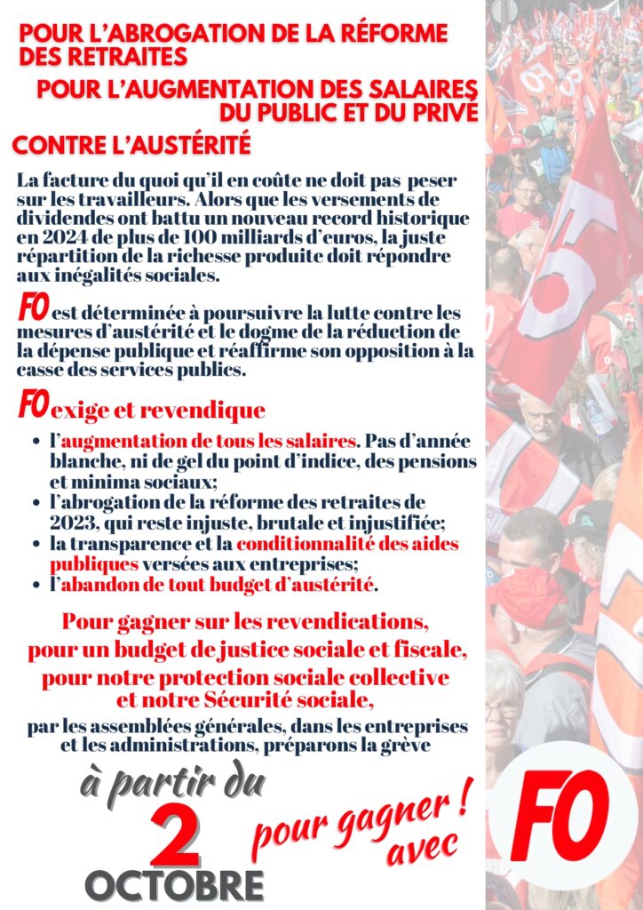 La FNEC FP-FO appelle ainsi les personnels à se réunir dans leurs écoles, dans leurs établissements, dans leurs services pour décider la grève et rejoindre toutes les initiatives qui seront prises pour bloquer le pays… Elle s’est adressée aux autres fédérations de l’Education nationale pour leur proposer d’appeler les personnels à la grève à partir du 2 octobre, et d’organiser les assemblées générales pour décider sa reconduction.