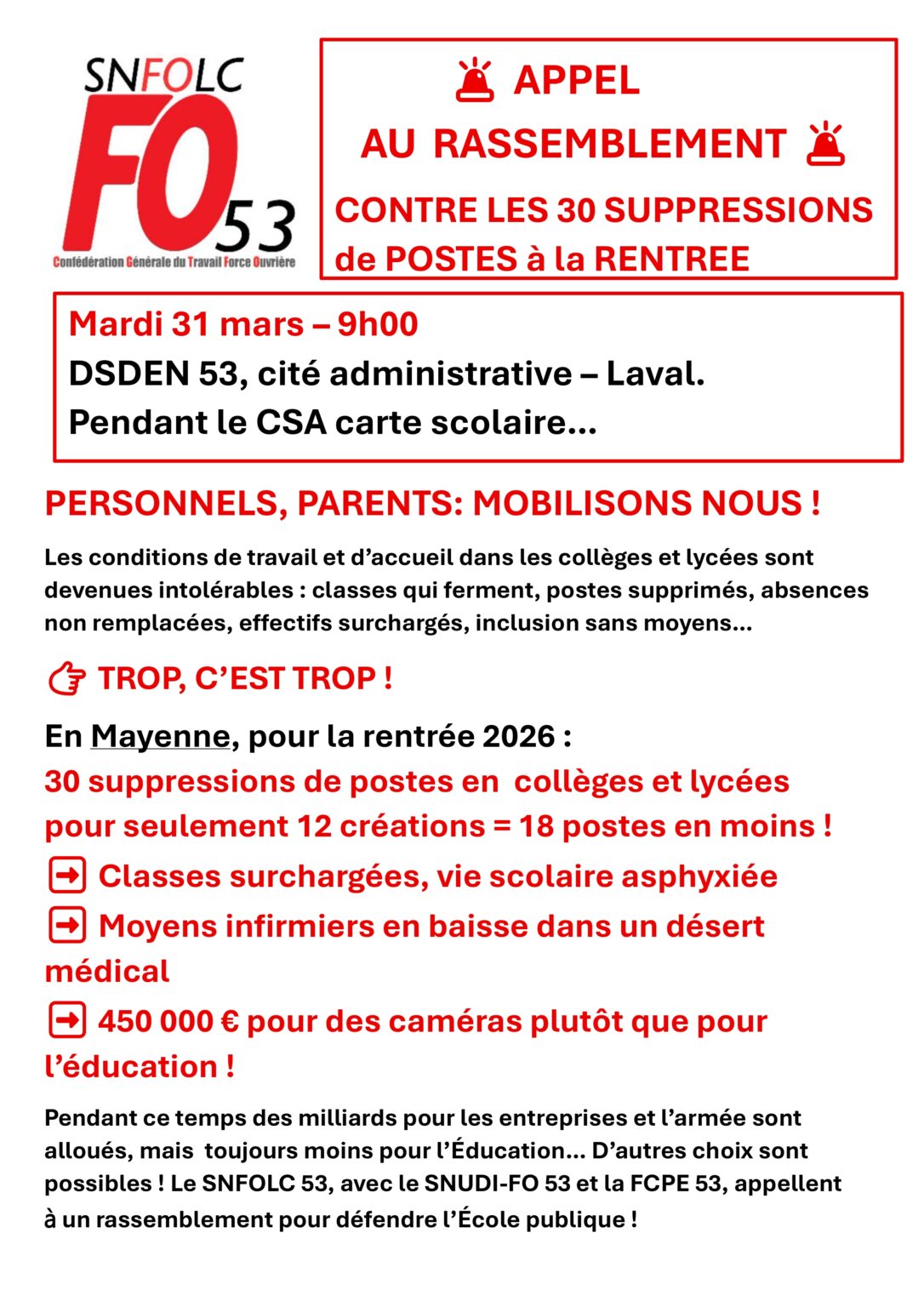 Non aux suppressions de postes : rassemblement le 31 mars Posted on 29 mars 2026 by SNFOLC53 Lien : Appel pour le 31 mars