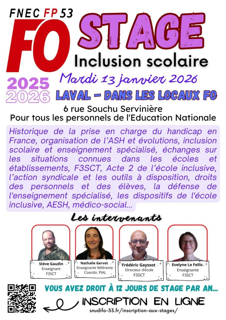 - Stage inclusion scolaire : le mardi 13 janvier 2026 (pour tous les personnels)