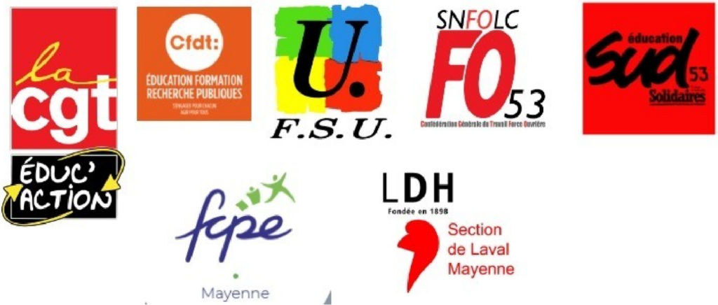 CGT éducation public et privé, CFDT éducation public et privé, FSU, FO Lycées et collèges, Sud éducation, FCPE, LDH Laval Mayenne